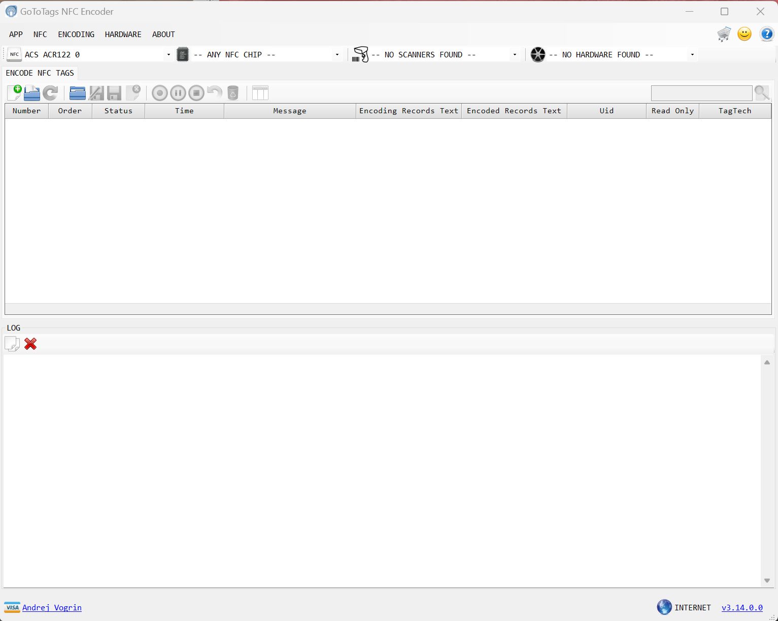 Najprej preverimo če imamo zaznan NFC bralnik (Encoder), v našem primeru ACS ACR122. To vidimo v drugi vrstici na prvi poziciji. V primeru če želite lahko preko NFC-ja krmilite tudi druge naprave kot so različni skenerji ali čipi, ki jih nalepite na inventar in preko tega vodite inventuro.