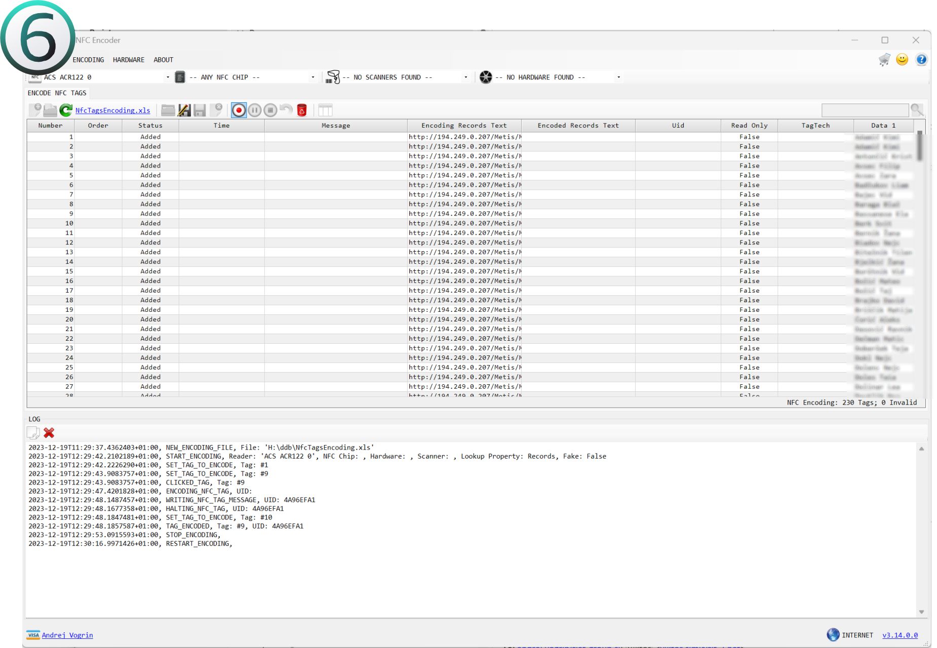 Ko smo pripravljeni. To pomeni, ko imamo vse NFC čipe razporejene na mizi, smo šli na stranišče in nas ne bo nobeden motil, kliknemo na "Record" ikono označena na sliki 6. Sedaj gre zares, sprožili smo program. Vse kar je potrebno narediti je postaviti NFC čip na čitalnik, ko zapiska je čip pripravljen in postavimo na čitalnik naslednji čip, ponavljamo do konca. Lahko vmes označimo tudi drugo ime in program bo šel od označenega imena dalje, kot je na sliki 7.