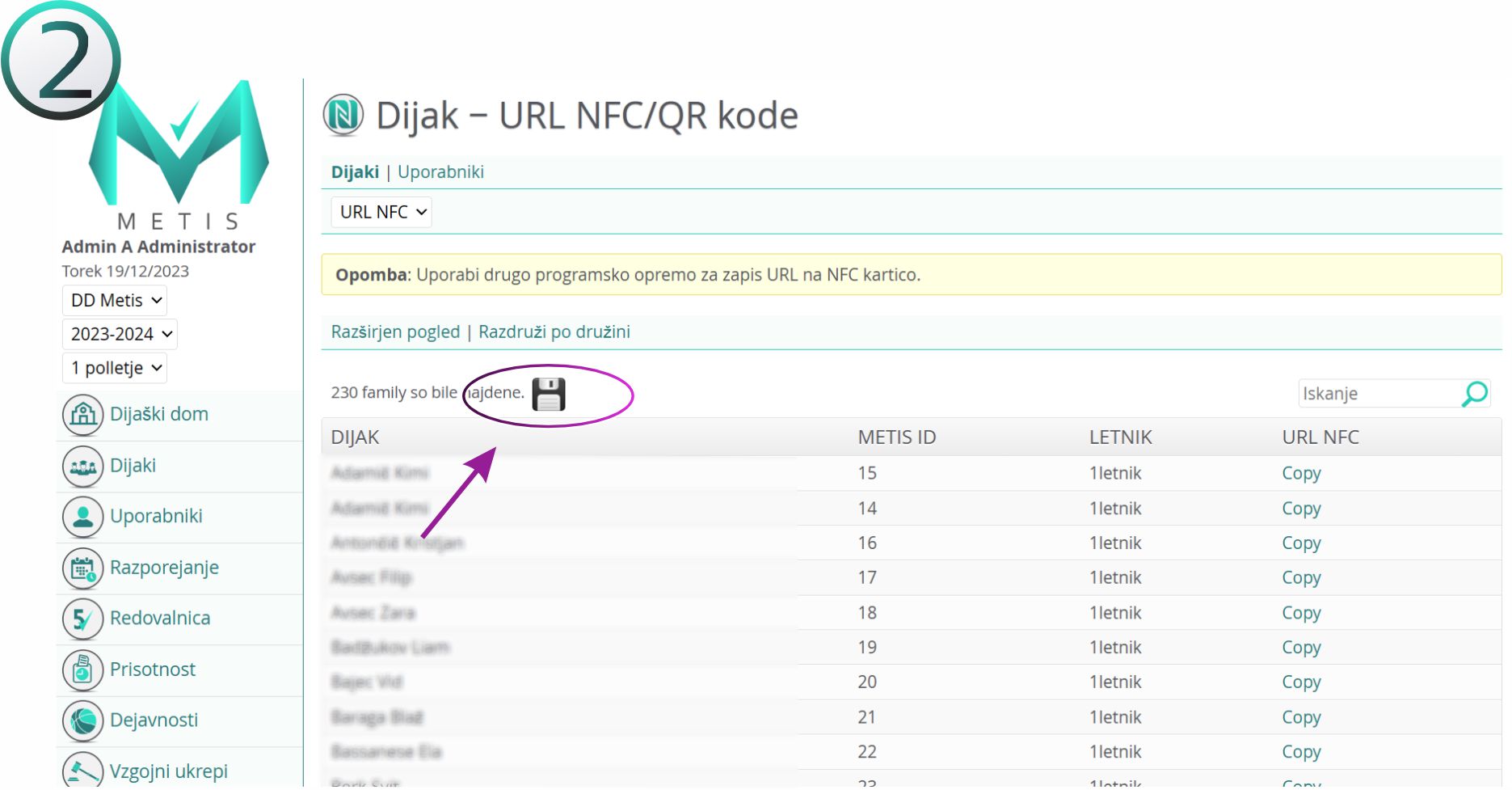 Izpis bo izgledal kot na sliki 3, za nas je pomemben podatek Priimek in Ime ter URL NFC. URL NFC je link koda do dijaka in je personalizirana za vsakega dijaka posebej.
