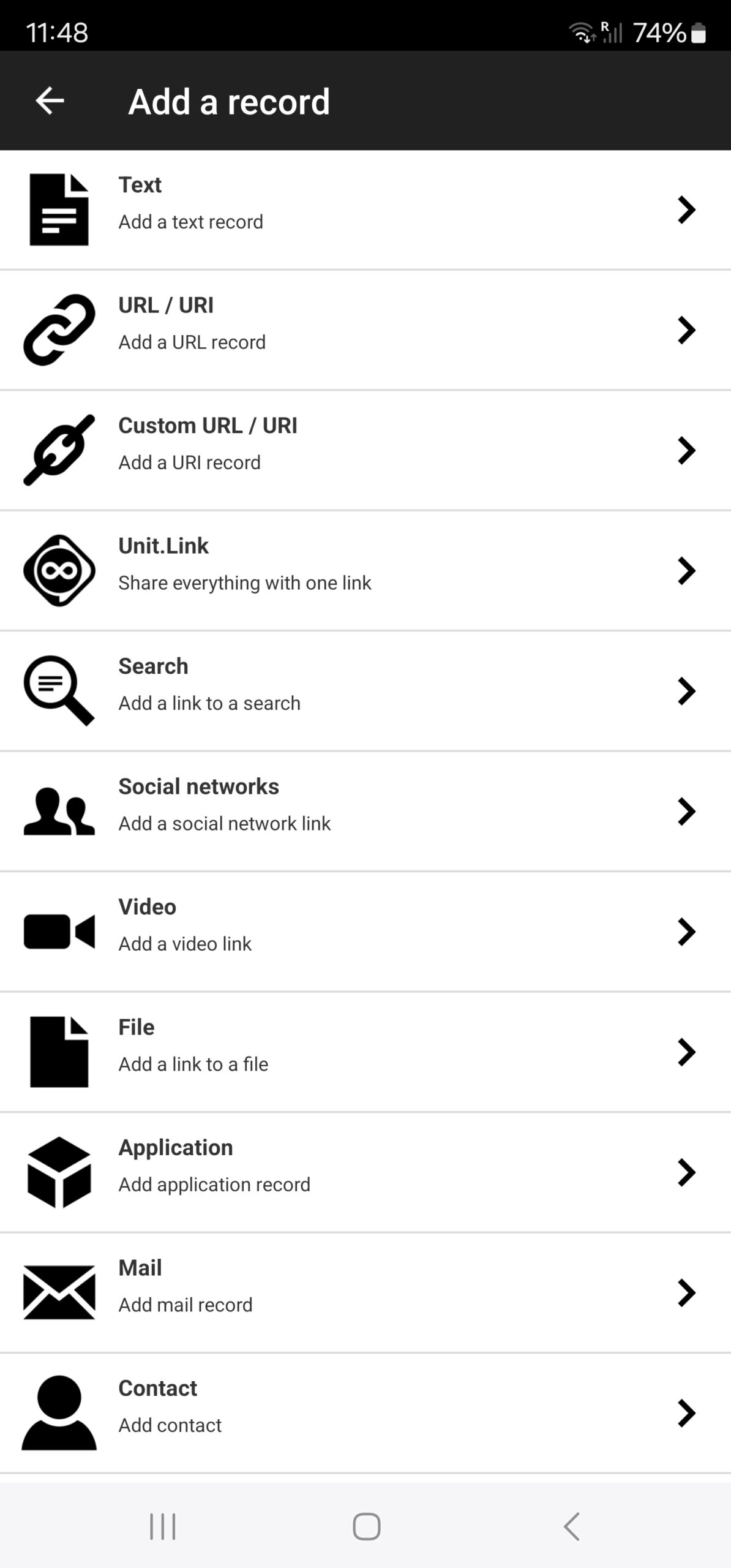 Na zgornji sliki je prikazan izpis funkcij, katere lahko zapišemo na NFC čip, mi izberemo "Custom URL/URI"