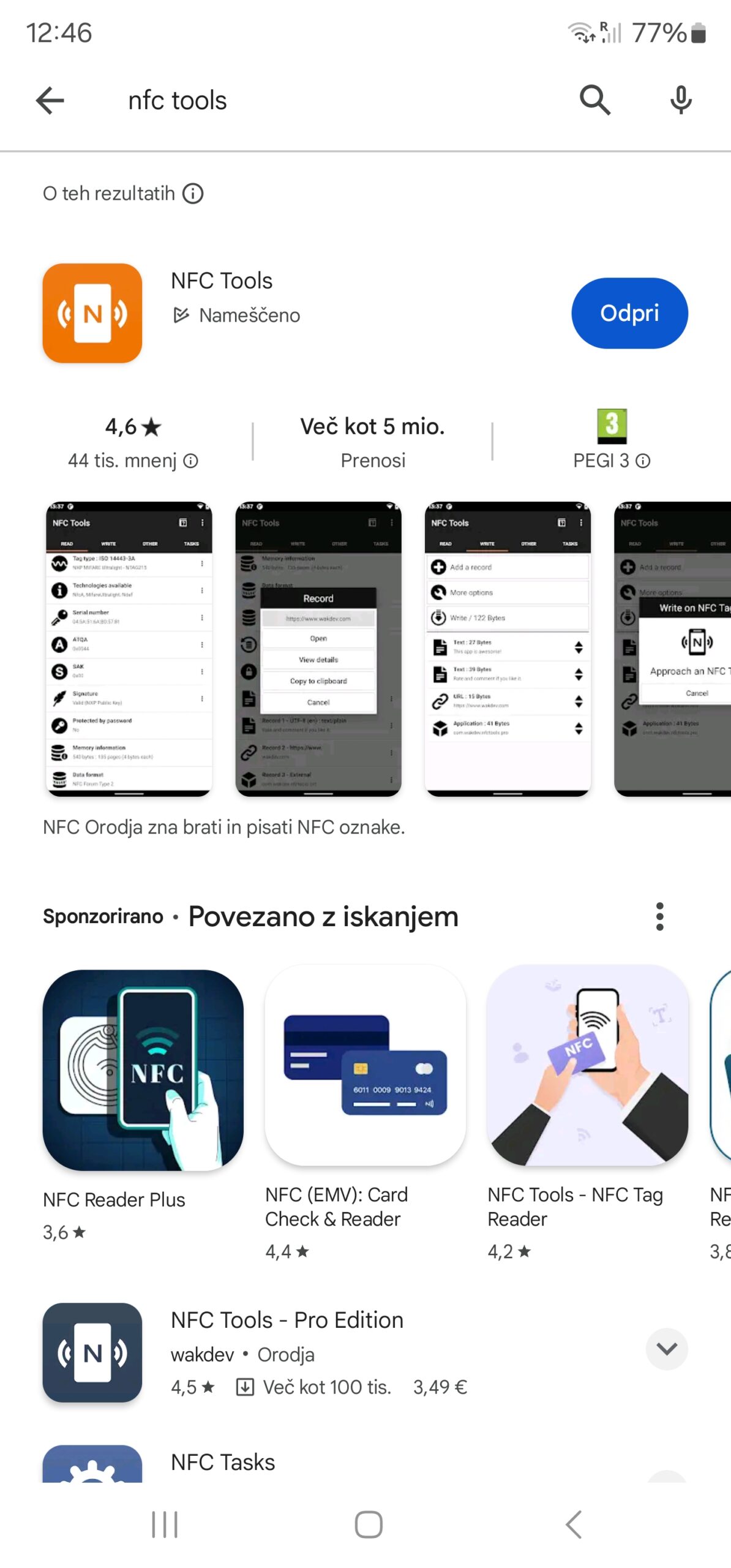 Najprej potrebujemo program, ki bo znal brati in zapisovati na NFC čipe. Predno namestite program, se prepričajte če vaš telefon podpira NFC protokol. Na Android napravah preverite na Nastavitve/Povezave/ NFC in brezstična plačila (funkcija more biti vklopljena)