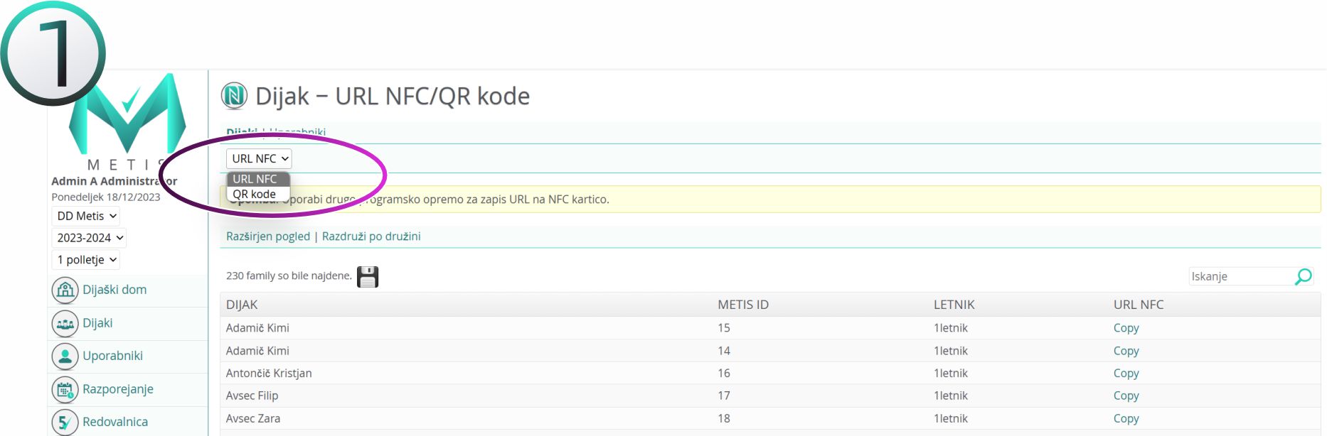 V Metisu gremo pod NFC/QR nastavitve, kliknemo na URL NFC/QR kode.