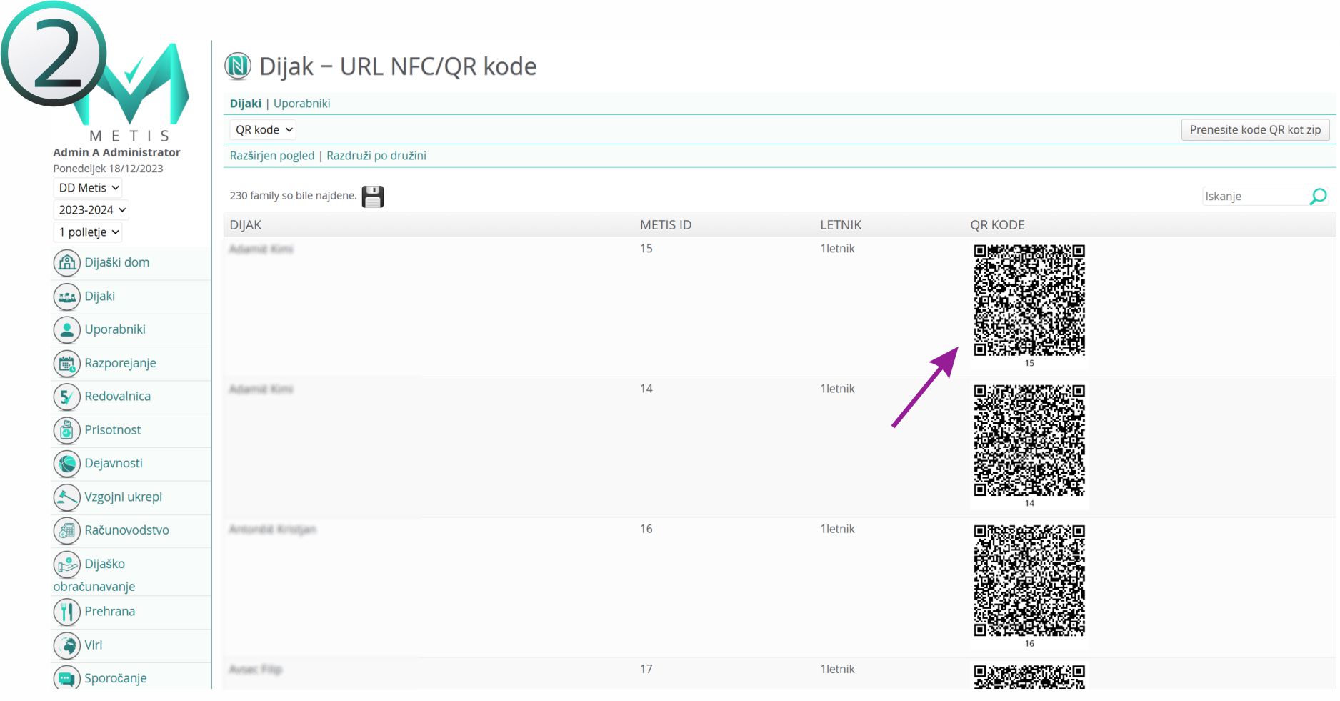 Namesto URL-a se nam izpišejo QR kode. Lahko si jih prenesemo na lokalni računalnik kot ZIP datoteko, gumb za prenos je v tem primeru desno zgoraj "Prenesite kode QR kot zip."