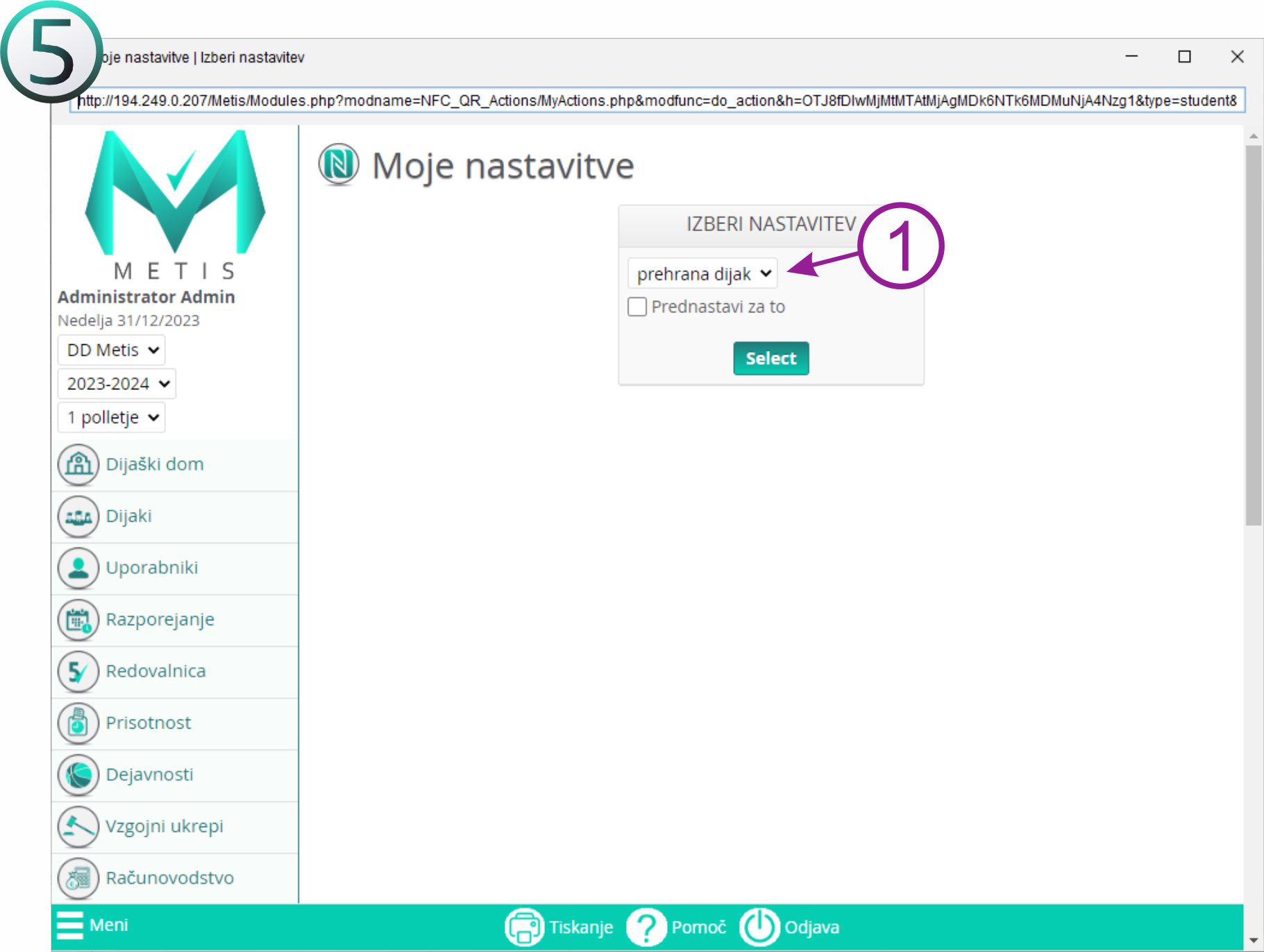 Še enkrat postavite NFC čip na NFC Reader (bralnik), odprle se vam bodo nastavitve iz katere točke želite, da Metis beleži dijake. V vašem primeru je to Recepcija in kliknite še na "prednastavi za to" (točko). S tem si Metis shrani točko, dokler ne boste izklopili računalnika, se vam verjetno ne bo potrebno več prijaviti.