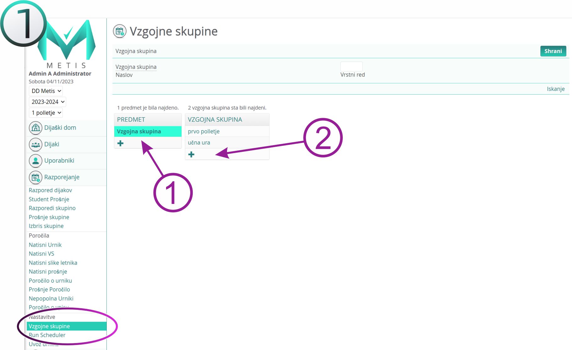 Dodamo novo vzgojno skupino, tako da kliknemo na "+" pod številko 2 na sliki