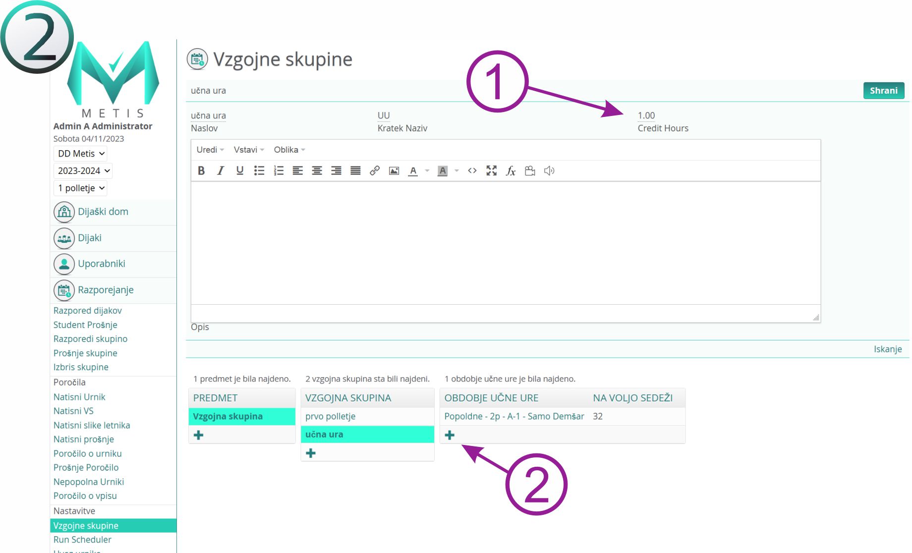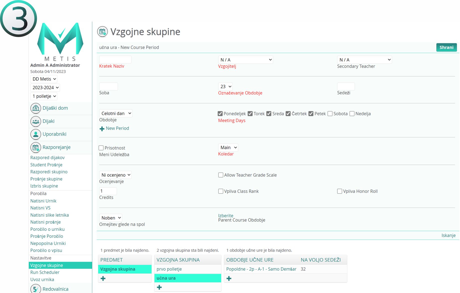 Novo vzgojno skupino dodamo z klikom na "+" v podmeniju "Obdobje učne ure"