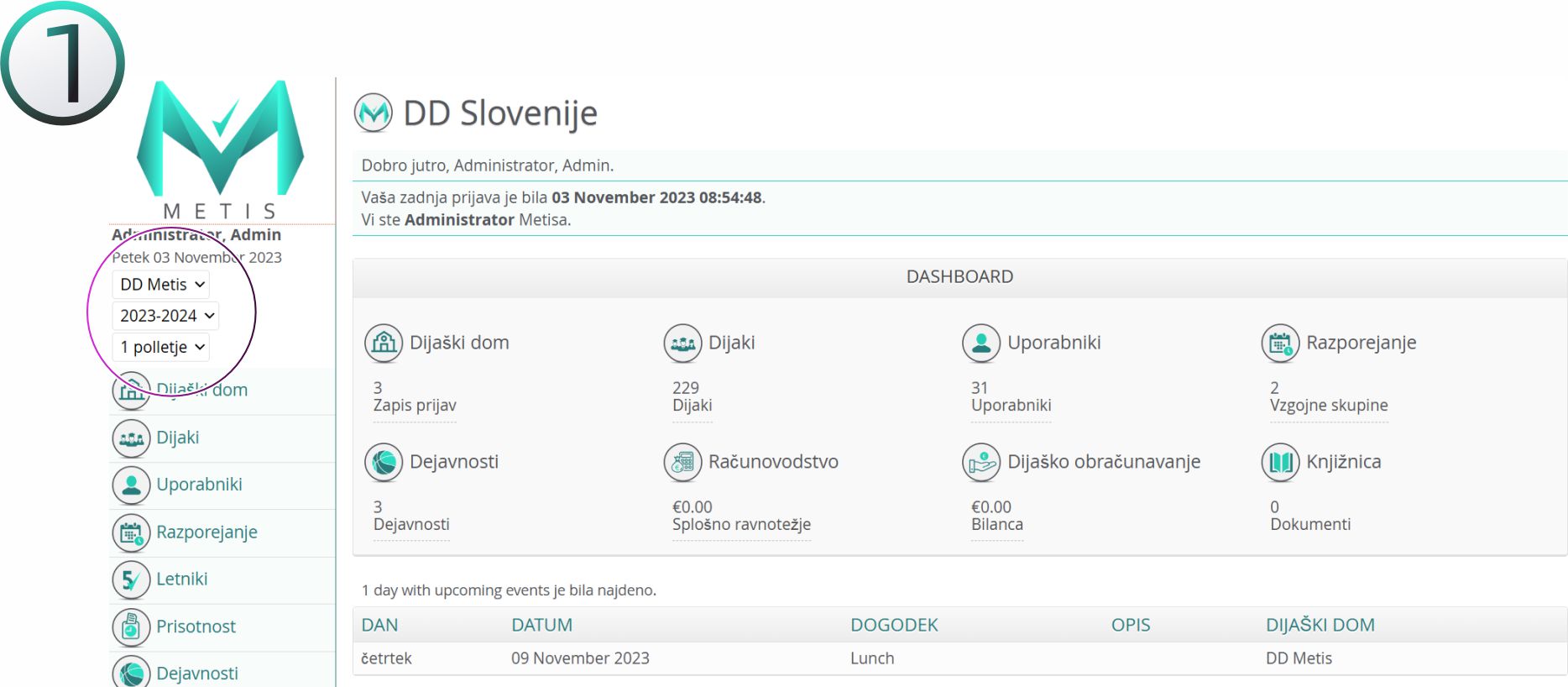 Metis uporablja šolsko leto za osnovo ostalih nastavitev. Vsi podatki, se nahajajo znotraj šolskega leta, zato je za naslednje šolsko leto potrebno narediti prenos. Hkrati pa imamo vpogled v prejšnja šolska obdobja in kartoteke. Na sliki 1 je prikazano trenutno šolsko leto, lahko se pa preko izpustnega menija prestavljamo na prejšna šolska leta.
