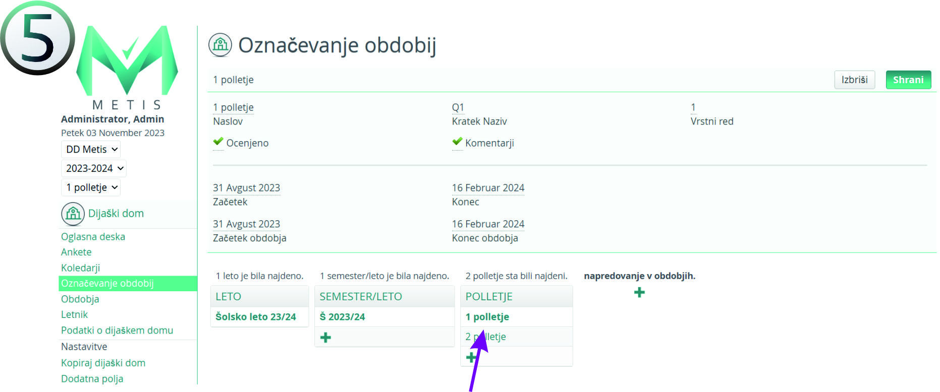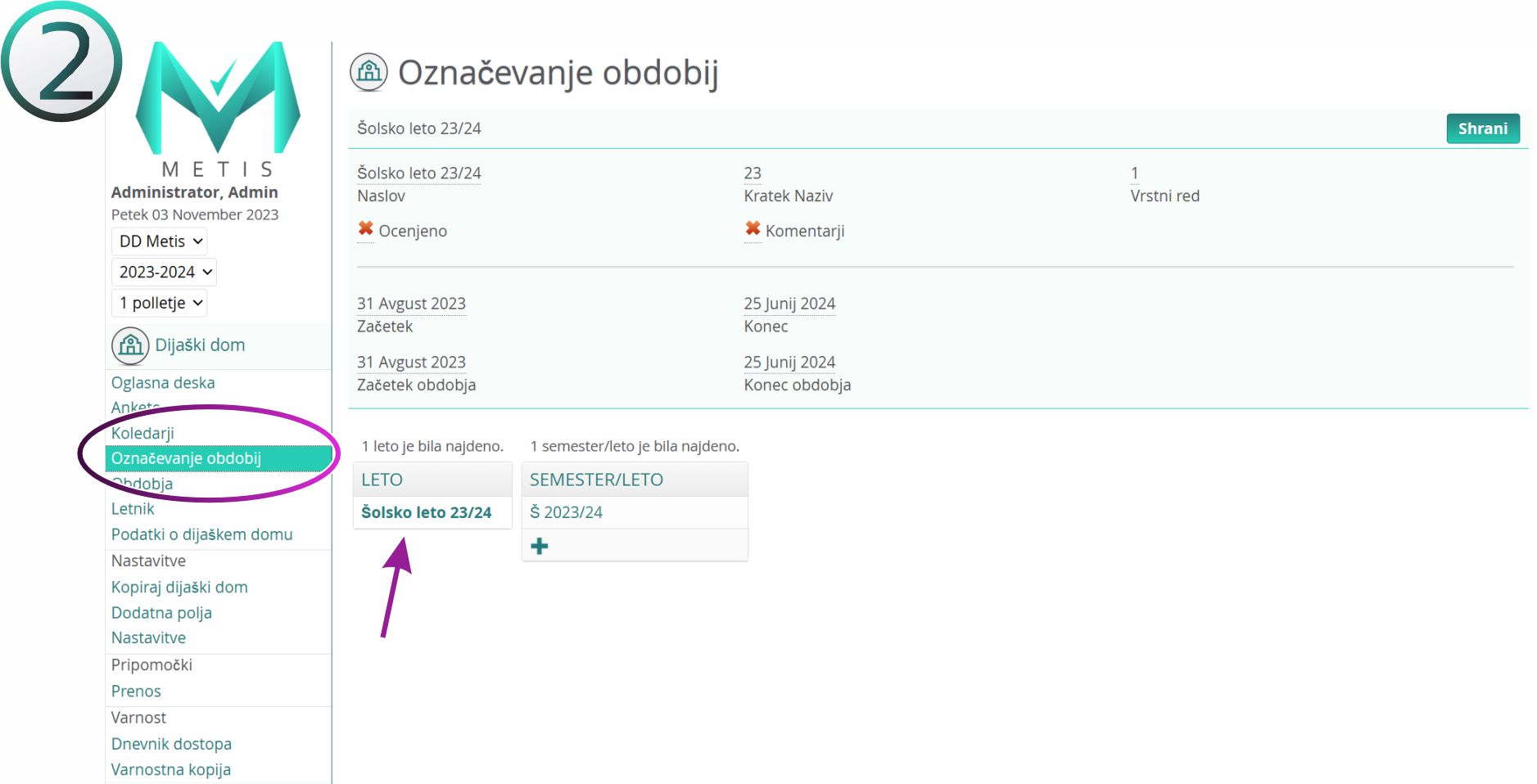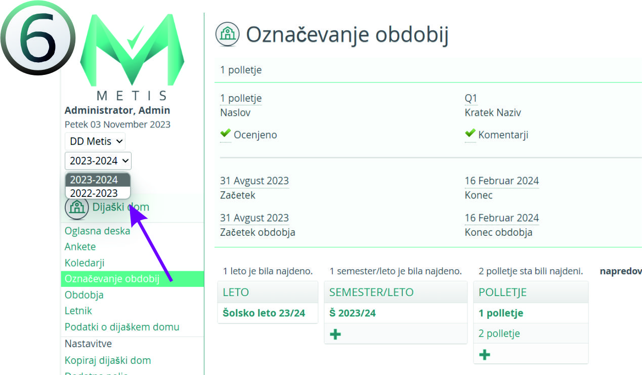 V Metisu se ročno nastavi šolsko leto z pripadajočimi polletji. Nastavimo datum začetek in konec šolskega leta ter datume začetka in konca polletij.
