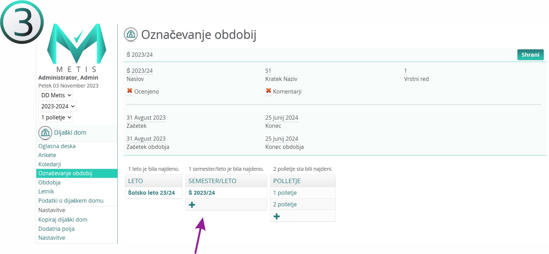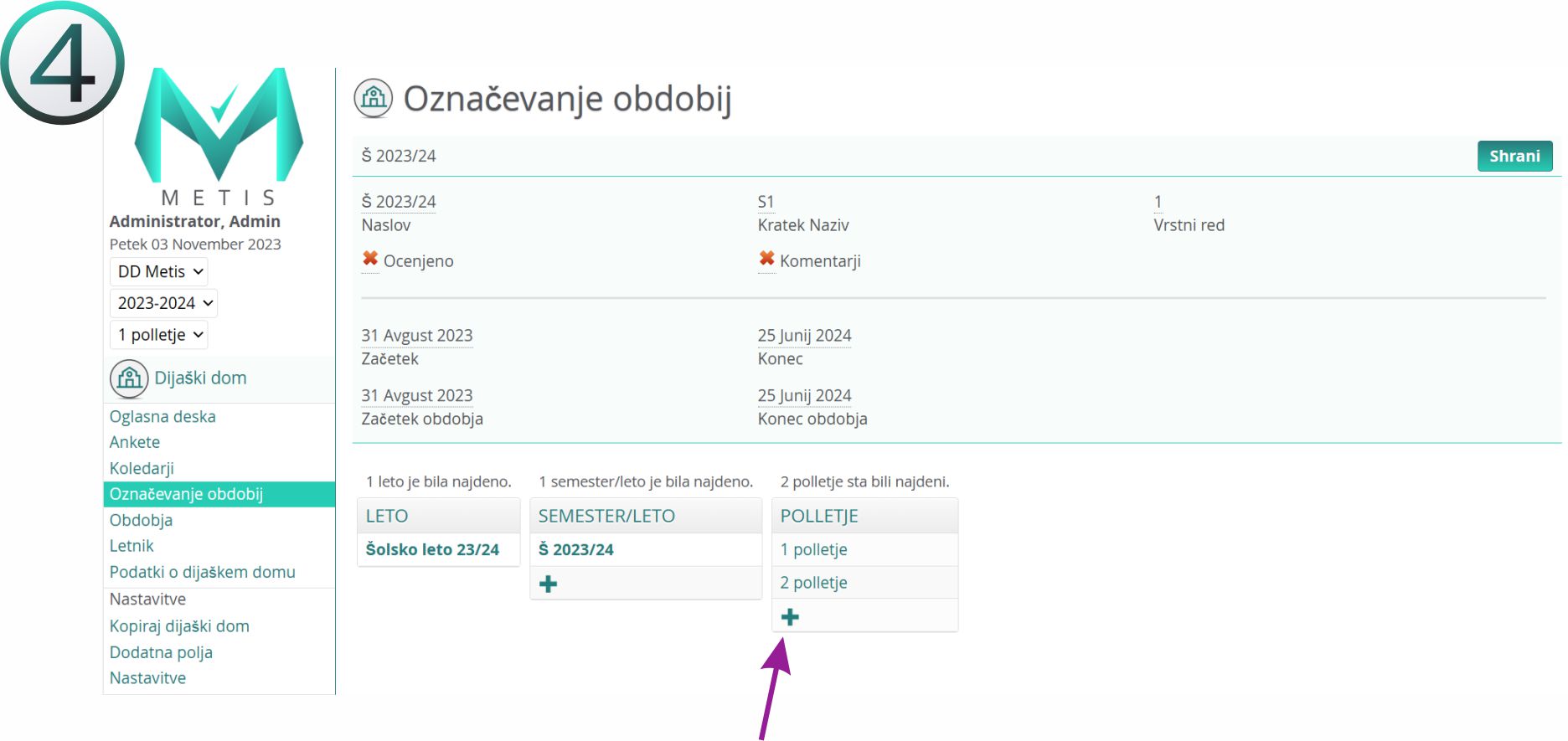 Ko shranimo "Semester/leto", kliknemo na + pod Polletje, tu nastavimo prvo in drugo polletje.