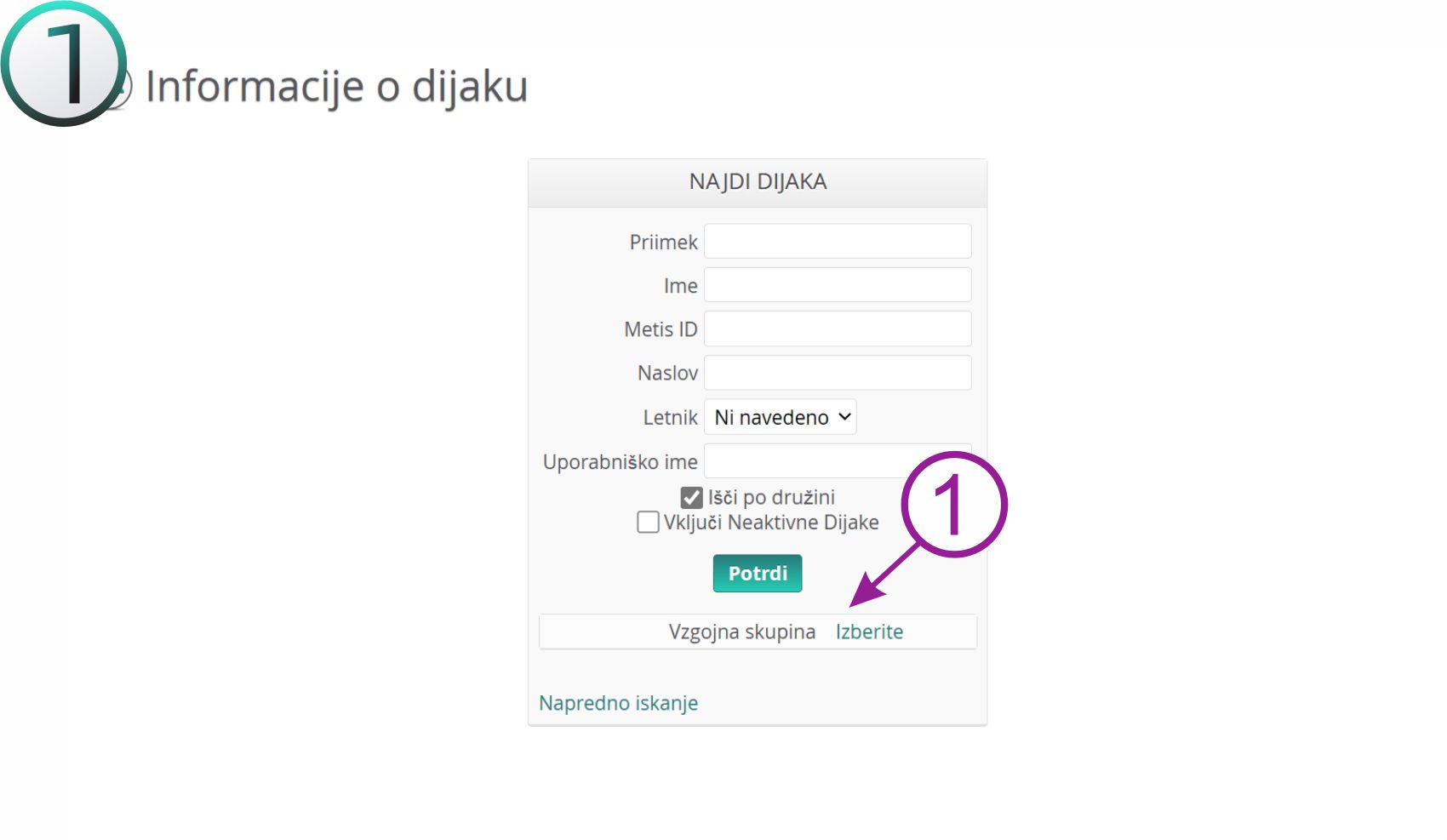 Na spodnji sliki imate prikazano opcijo "iskanje po vzgojni skupini"