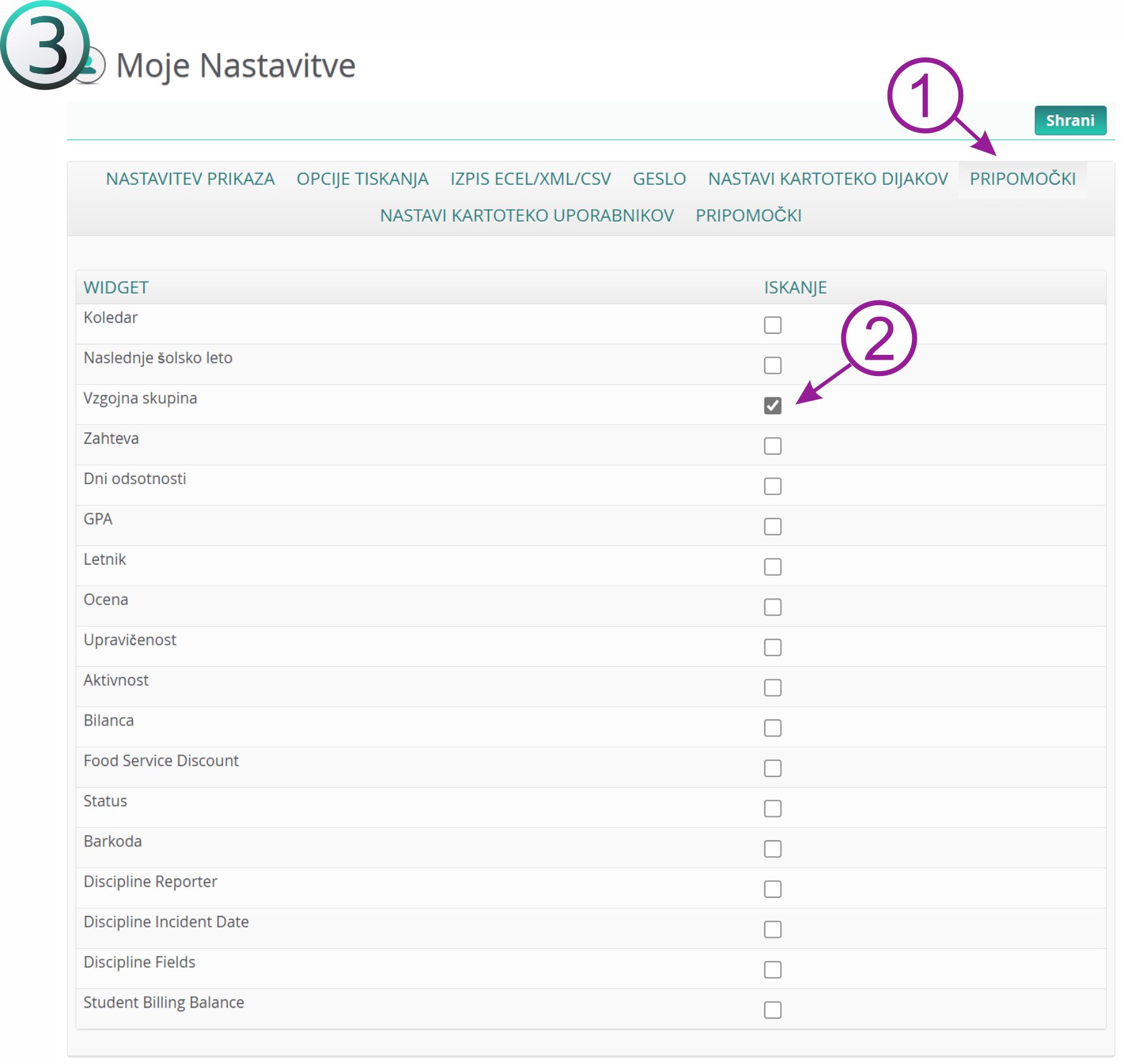 2. Označite "kljukico" pod vzgojne skupine in kliknite SHRANI.