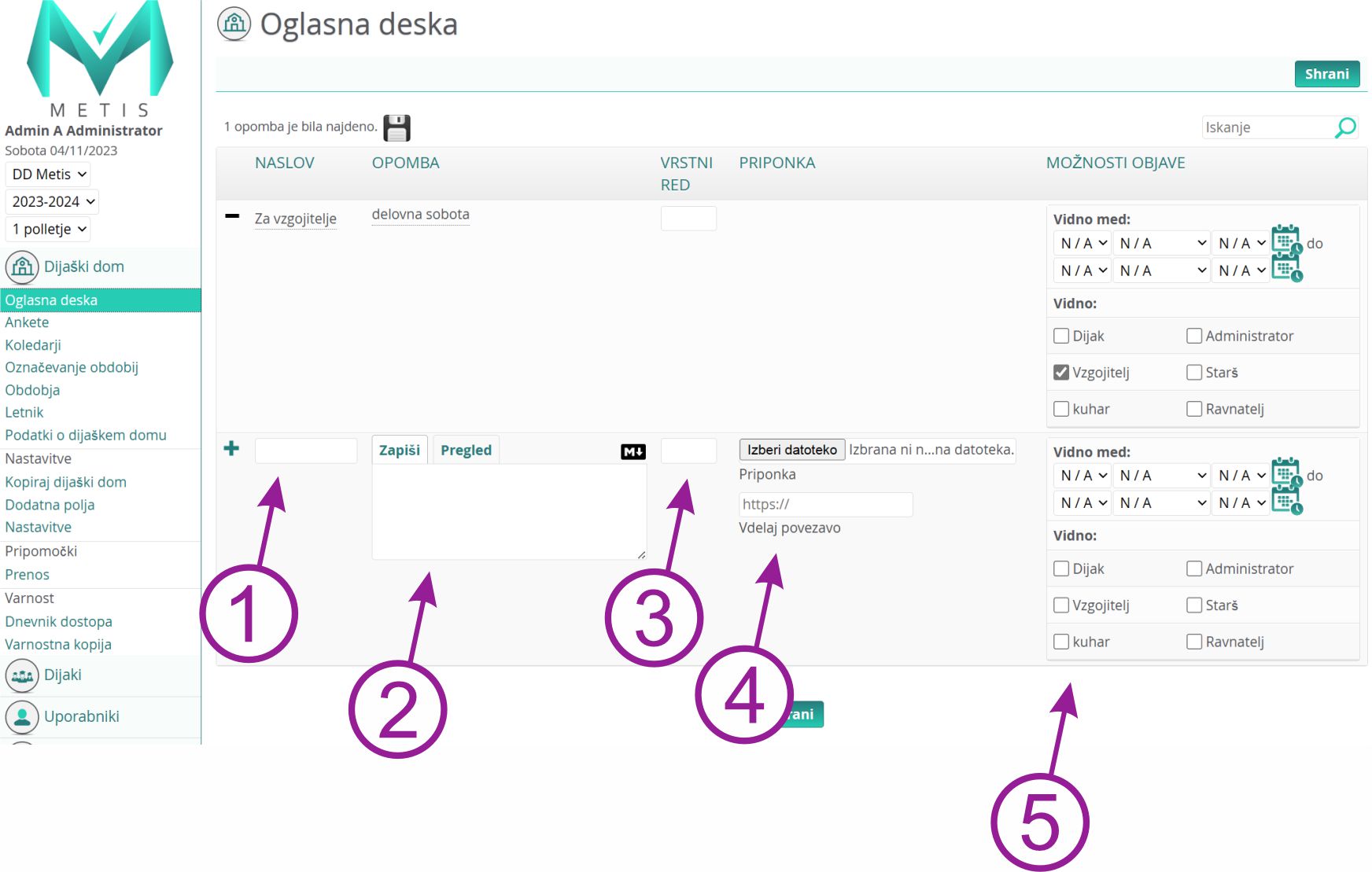 1. Naslov, tekst, ki bo viden kot naslov na oglasni deski