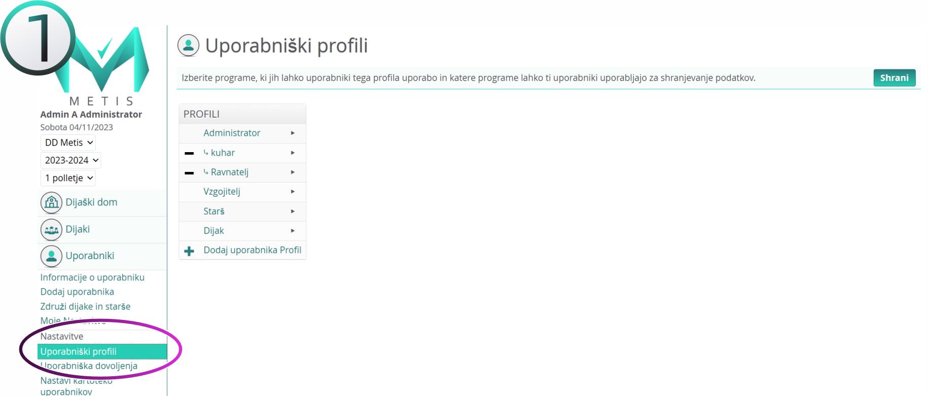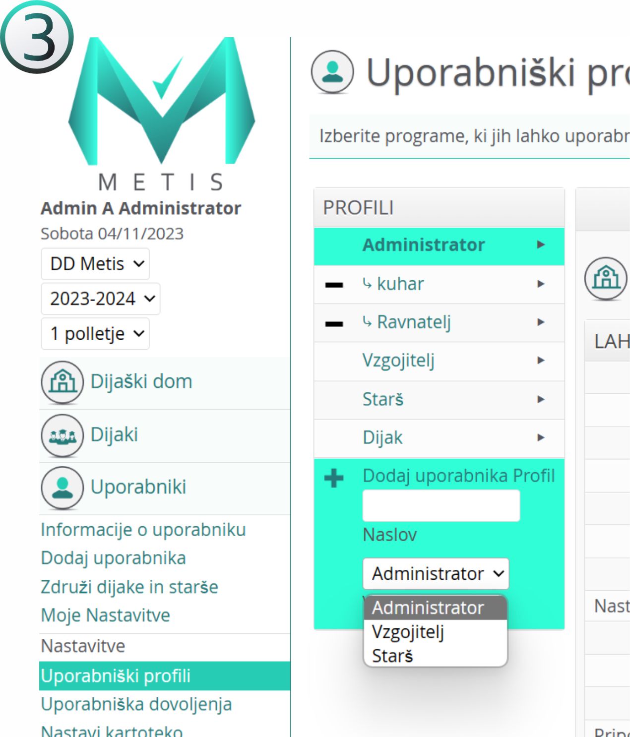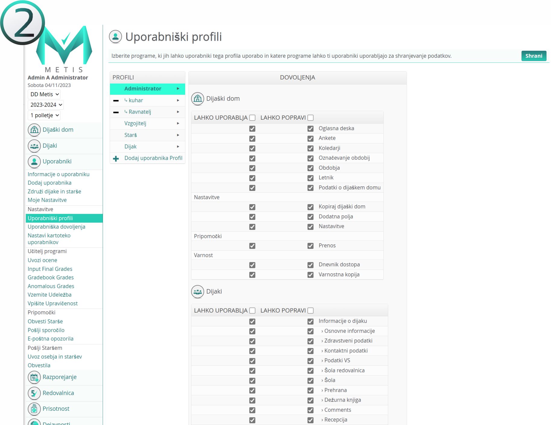 Pokažejo se nam osnovni profili: Administrator, Vzgojitelj, Starš, Dijak. Omenjeni profili so nastavljeni, vsak ima svojo vlogo pri dovoljenjih.
